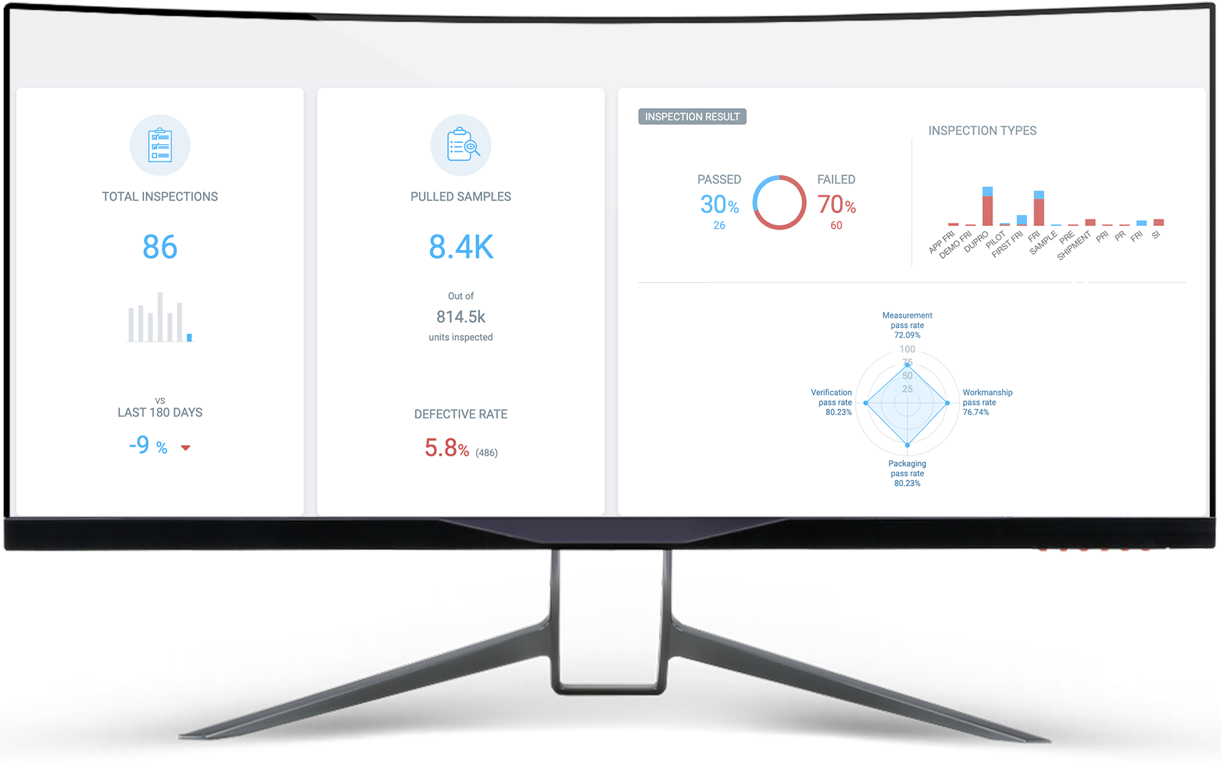Gain insights into inspections with the Inspection Result section, which displays the relative pass and fail rates as well as the different types of inspections performed. This is supplemented by a graph displaying the pass rates for packaging, workmanship, measurement, and verification, providing immediate insight into why the bulk of inspections may have passed or failed.