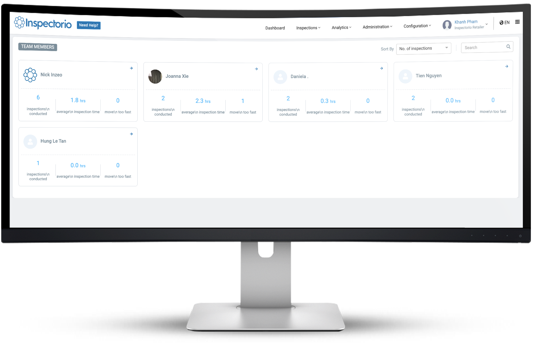 The Team Members section displays all inspectors active within your filter parameters, with the number of inspections conducted, average inspection time, and Move Too Fast alerts included for each inspector. You can sort this section by any of these three values. Search for any inspector by name and click on the arrow in the upper right-hand corner to view their performance details.