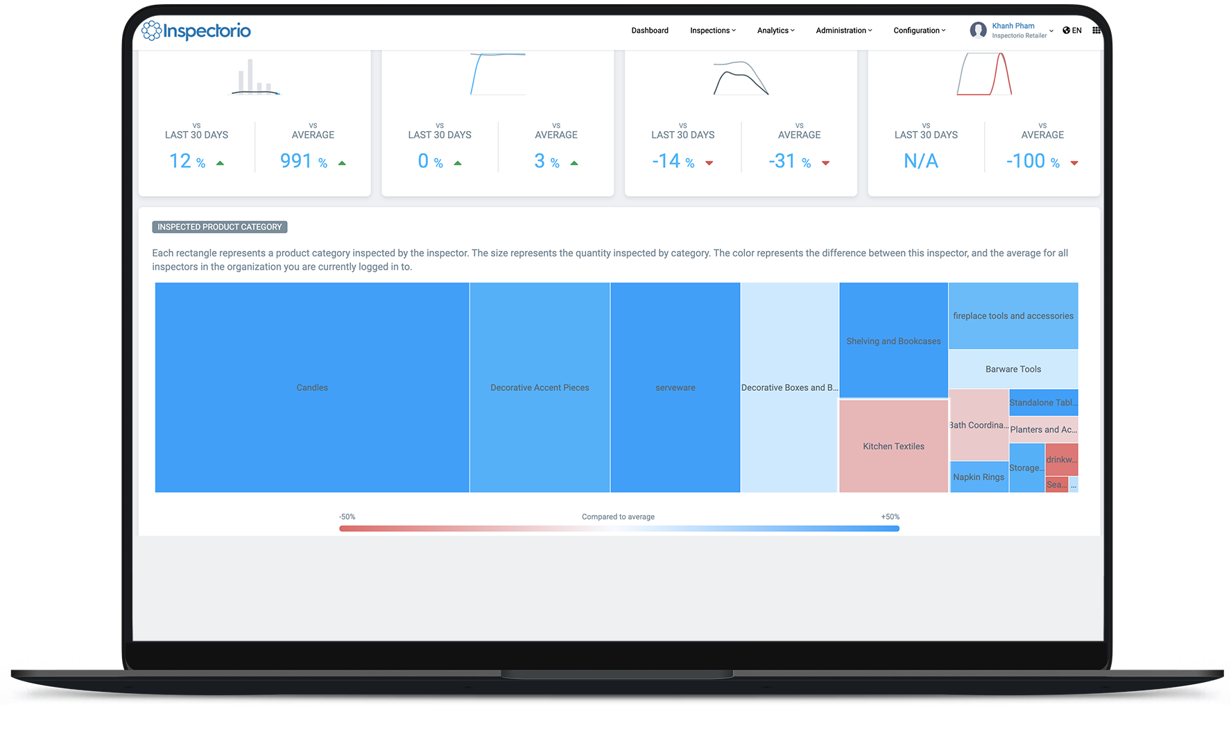 In the Inspected Product Category section, you will see the team member’s most inspected products, with each cell representing a different product category. For intuitiveness, the size of each cell corresponds with the quantity of inspections and the color represents the deviation of this inspector’s metrics from the team average. Hovering over each cell provides further details into that particular product category.
