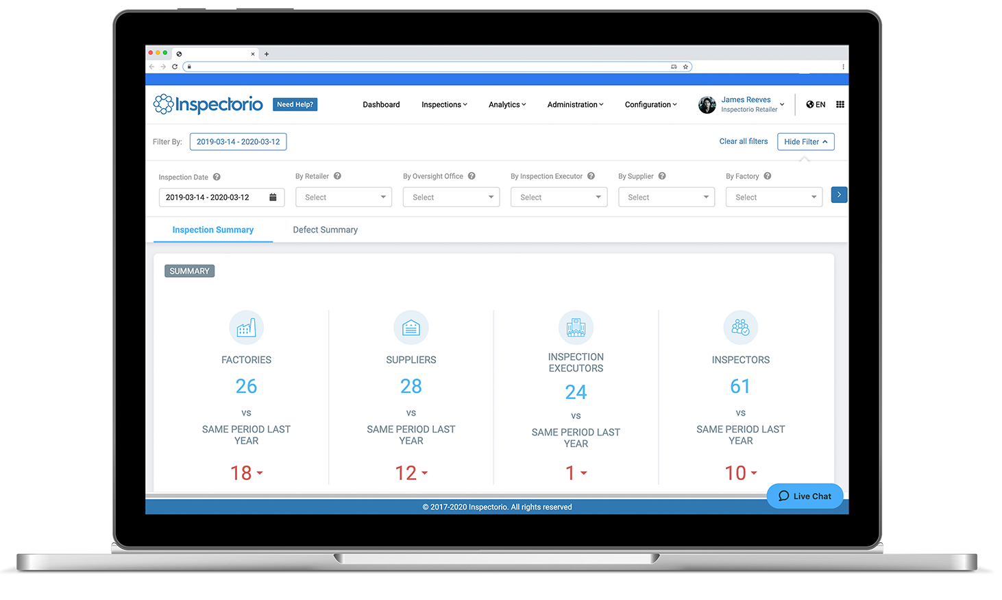 Los análisis sólidos de Inspectorio Sight le brindan el poder de tomar decisiones más precisas y la flexibilidad para profundizar en los detalles para colaborar mejor con los socios, o alejarse y ver el panorama general para evaluar el rendimiento de su ecosistema en su conjunto.