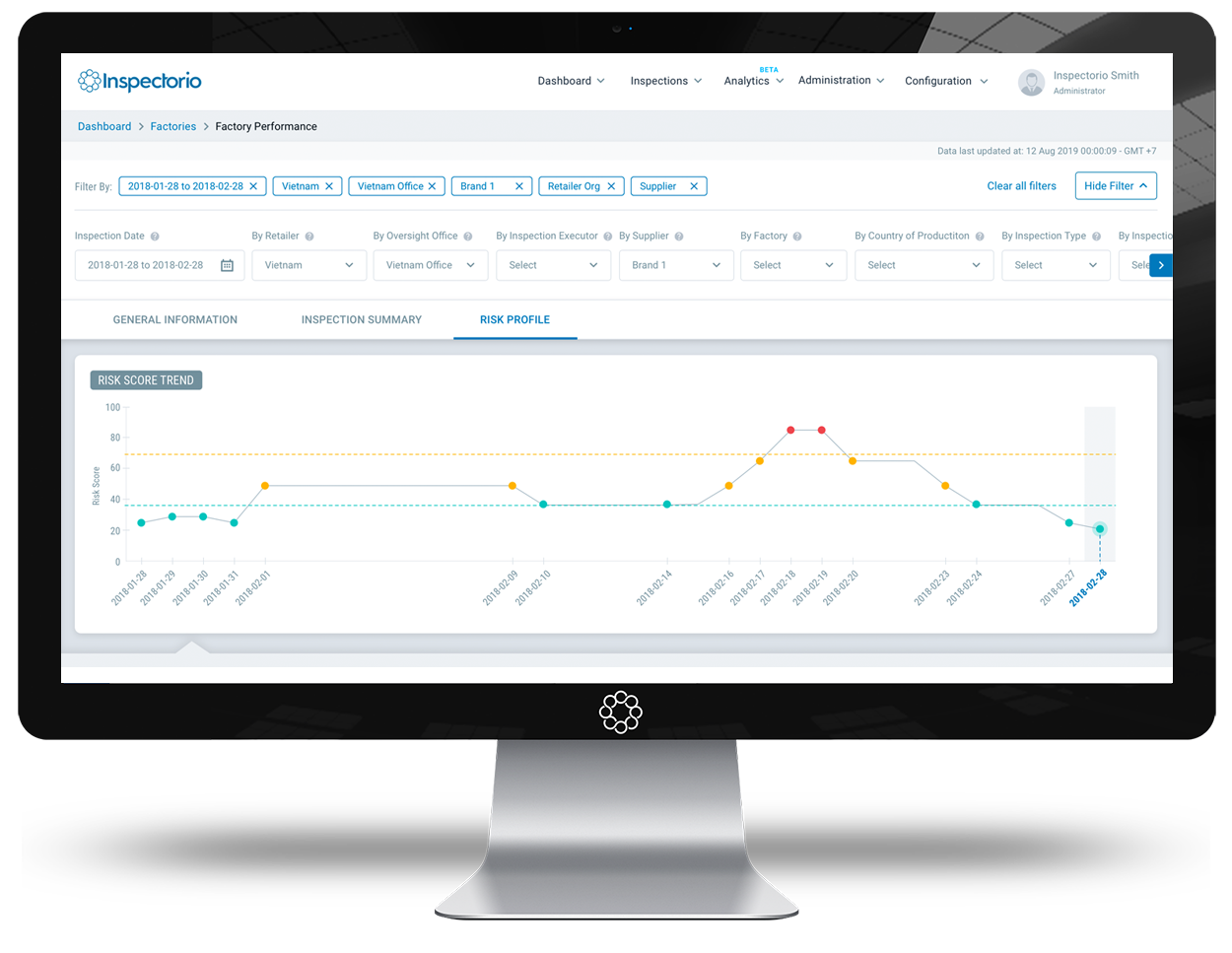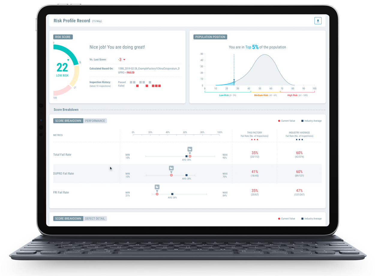 Factory Risk Analytics permite a las marcas implementar un Programa de Control de Calidad dinámico basado en los riesgos. Con un umbral configurable, puede evaluar el nivel de riesgo actual y la puntuación de las fábricas de su ecosistema y supervisarlas horas extras, identificar métricas clave que contribuyen a la puntuación de riesgo y simular la puntuación de riesgo futuro en función de los datos actuales para planificar mejoras.
