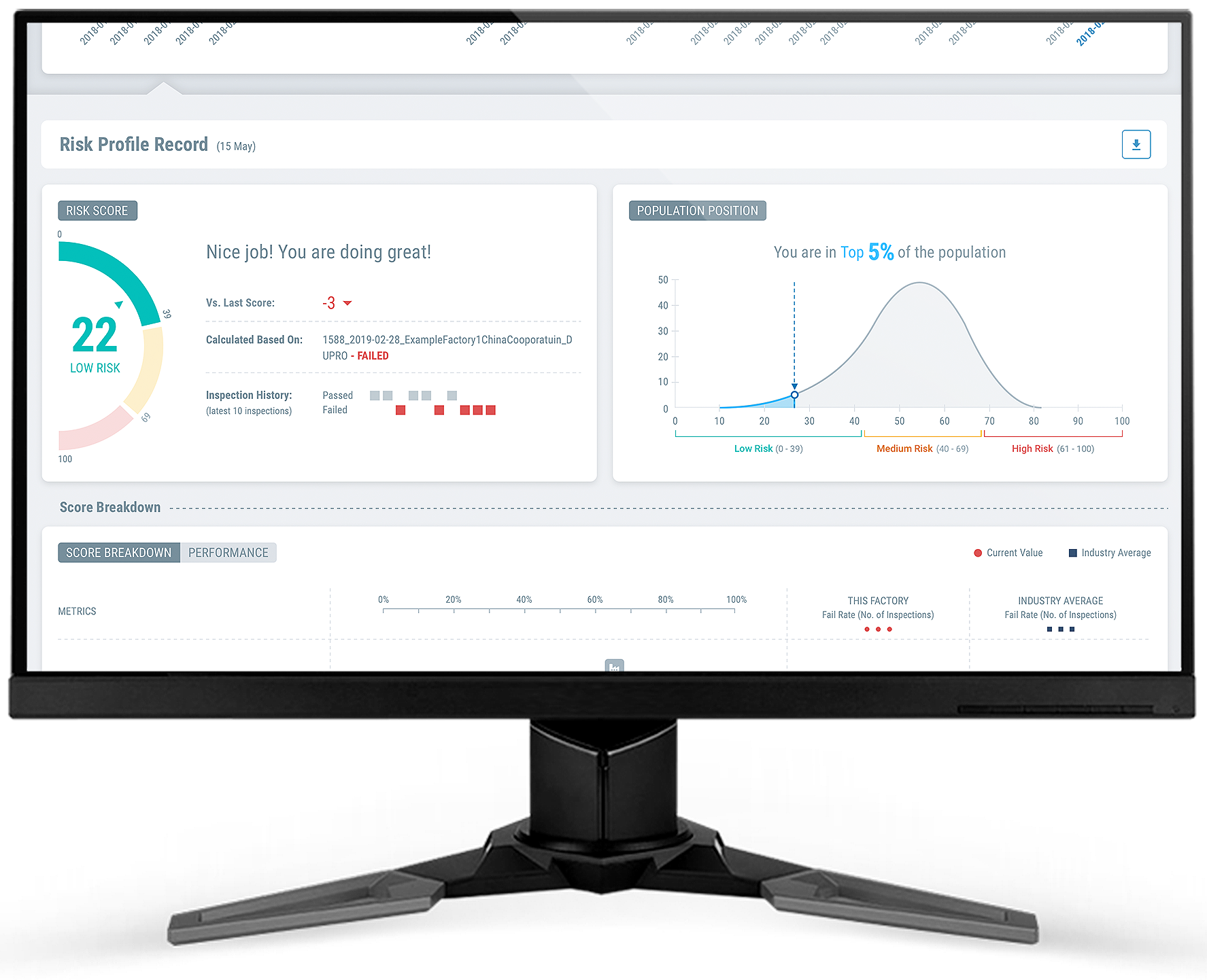 The Score Breakdown tool outlines the metrics contributing to the risk score for defects. Factories, vendors, brands, and retailers can view over 100 different attributes that correlate with risk of failure, such as Total Fail Rate and During Production Fail Rate, and compare them with the previous score and the industry average. Additionally, two separate modules show recency factors and volume factors. This empowers all involved parties to take in the big picture, then hone in to precisely identify which attributes are having the greatest effect on overall risk.